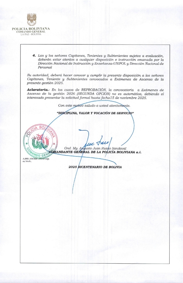 LA ORDEN ESPECIAL DE CONVOCATORIA A EXÁMEN DE ASCENSO EN LOS GRADOS DE CAPITANES, TIENIENTES, SUBTENIENTES, SUBOFICIALES Y SARGENTOS GESTIÓN 2025